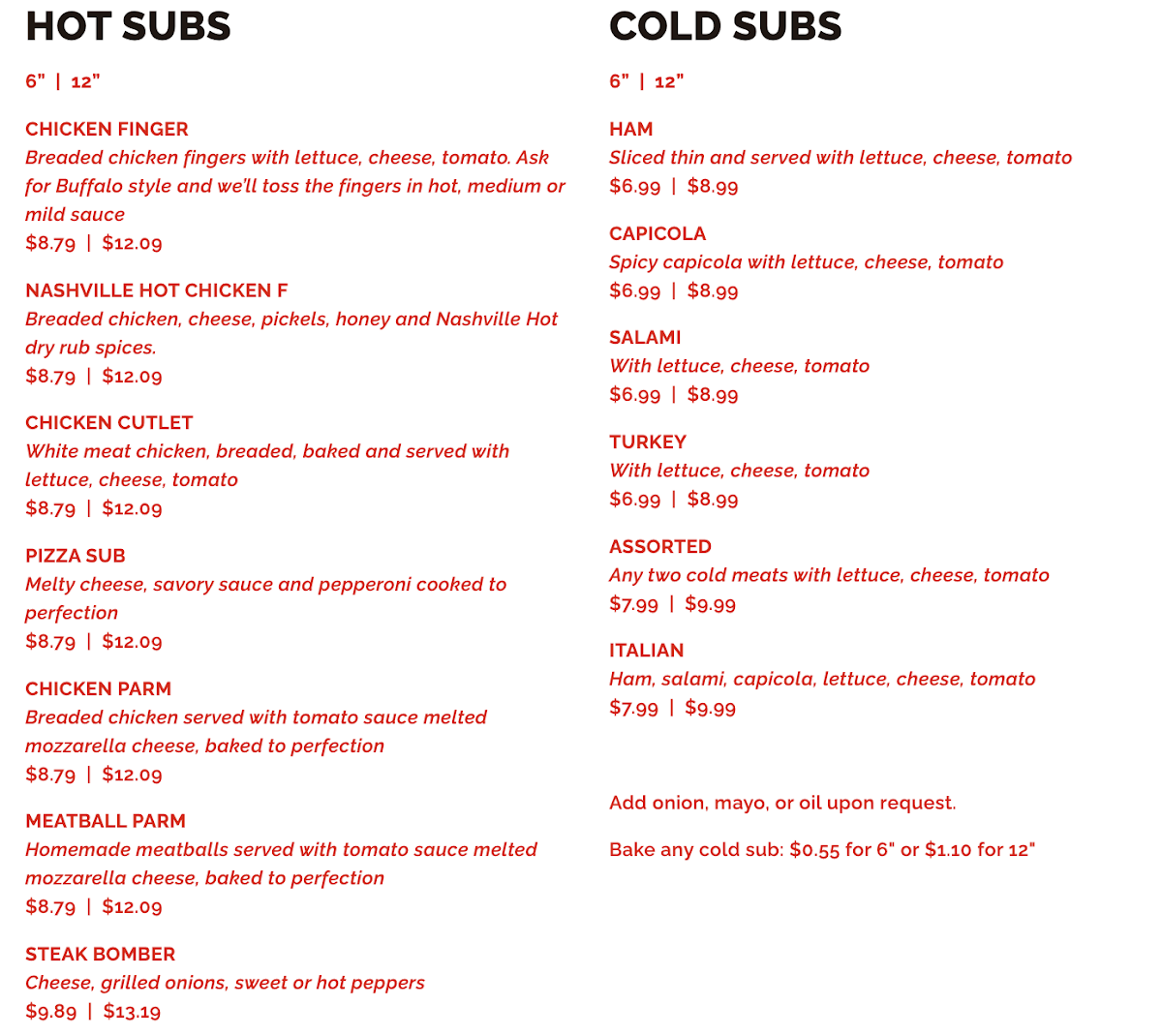 - Cold Subs: Featuring Italian, salami, and turkey choices, perfect for a quick bite.